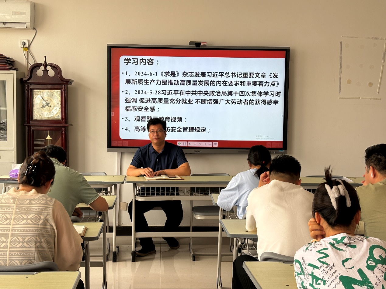 会上,大家共同学习了:《求是》杂志发表习近平总书记重要文章《发展新质生产力是推动高质量发展的内在要求和重要着力点》;习近平在中共中央政治局第十四次集体学习时强调促进高质量充分就业 不断增强广大劳动者的获得感幸福感安全感;高等公司消防安全管理规定;共产党员网党纪学习教育专题:《中国共产党纪律处分条例》解读一。