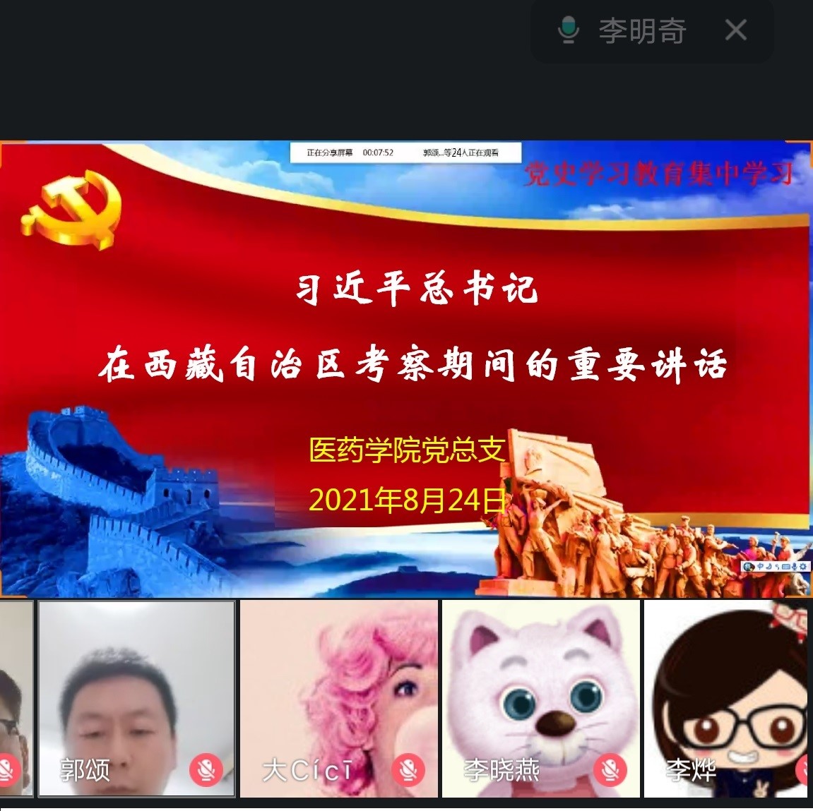 按照上级和公司党史学习教育领导小组的安排部署,8月24日下午,​公司党总支组织全体党员利用QQ网络视频形式集中学习了习近平总书记在西藏自治区考察期间的重要讲话,党总支书记李明奇主持学习。