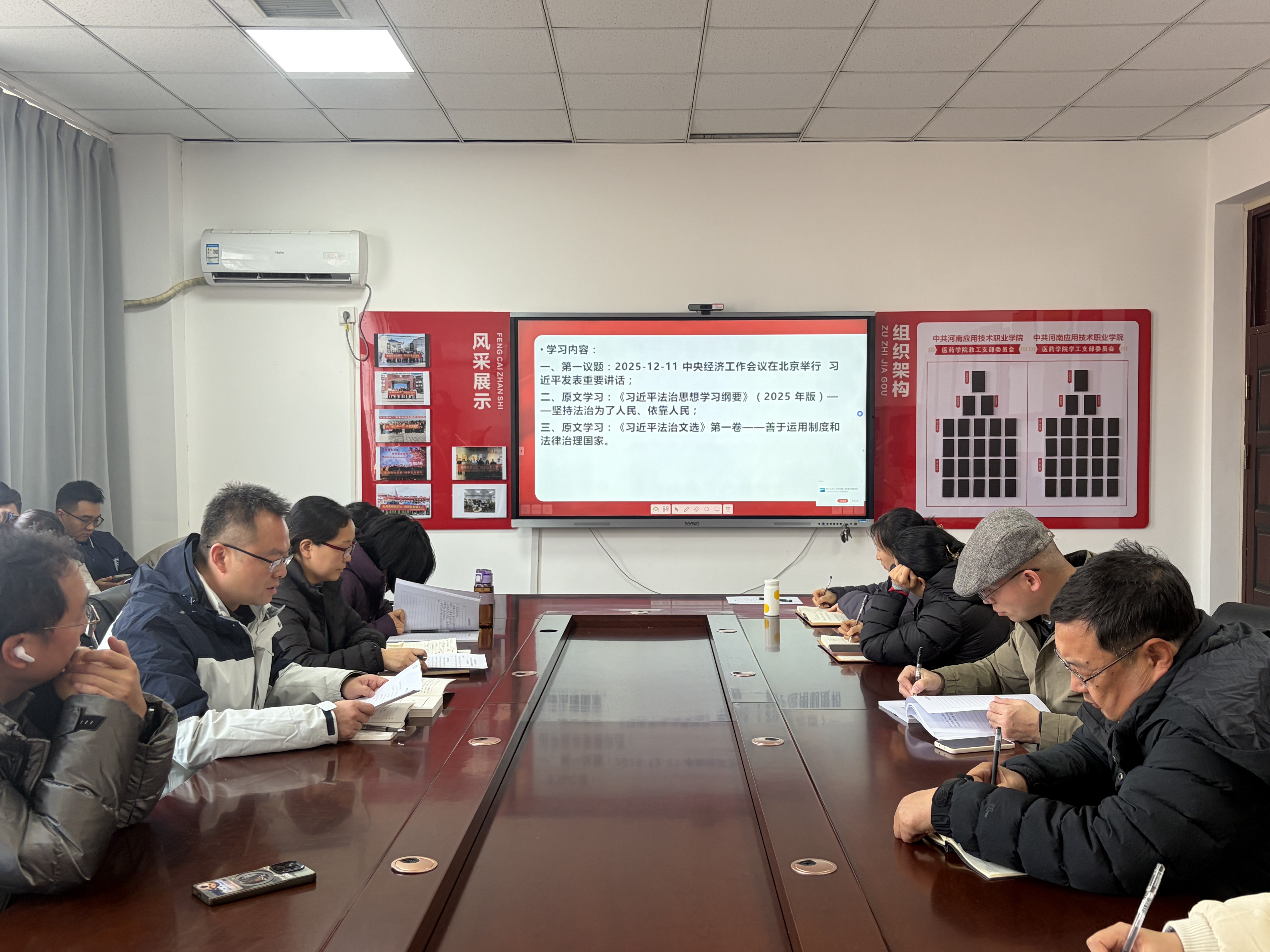 会上,张亮带领全体教师深入学习第一议题:“中央经济工作会议在北京举行 习近平发表重要讲话”,随后领学《习近平法治思想学习纲要》--坚持法治为了人民、依靠人民;公司副经理唐贝领学《习近平法治文选》第一卷--善于运用制度和法律治理国家。