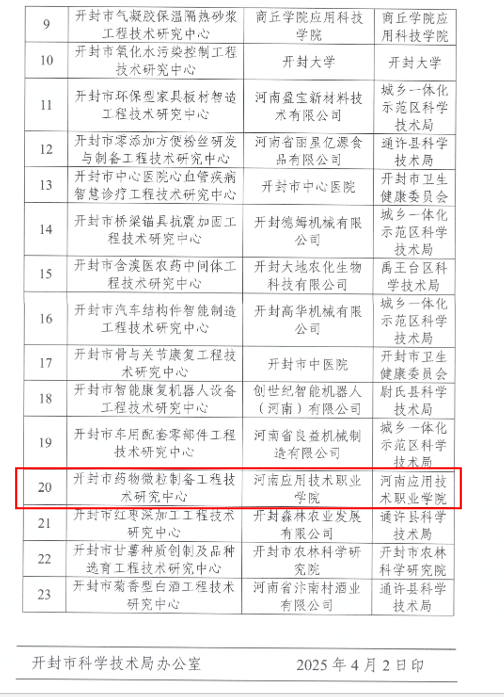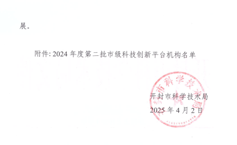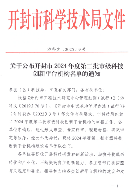 近日,开封市科学技术局公布了“开封市第二批科技创新平台机构拟认定名单”,在公司相关部门和兄弟单位的大力支持下,公司药物微粒制备工程技术研究中心被认定为“开封市药物微粒制备工程技术研究中心”。该中心联合上海金不换兰考制药有限公司、河南大学共建,标志着公司在药物微粒制备技术领域实现教育链、创新链与产业链的深度融合,为开封市培育战略性新兴产业注入新动能。