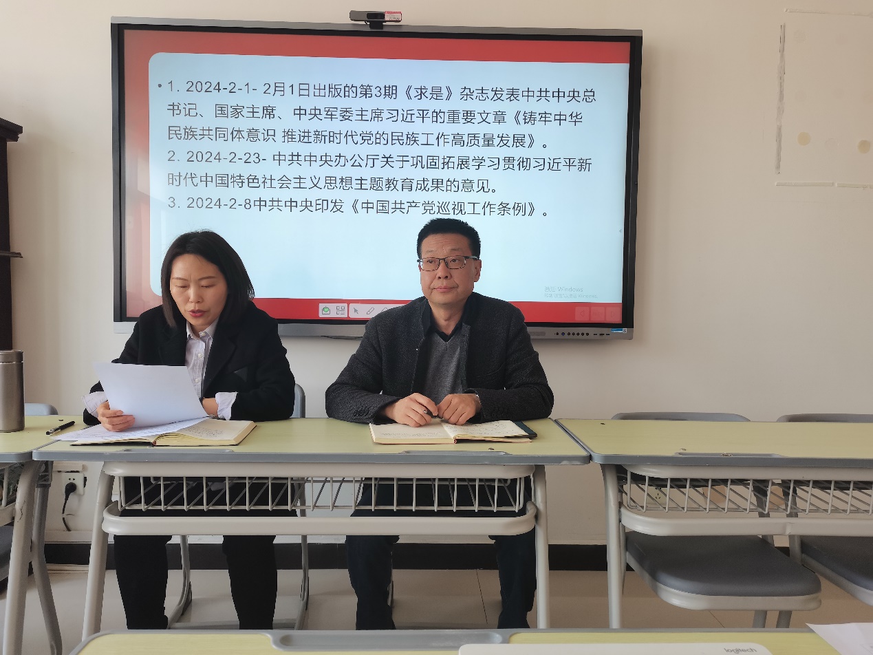 会上,大家共同学习了:1.2月1日出版的第3期《求是》杂志发表中共中央总书记、国家主席、中央军委主席习近平的重要文章《铸牢中华民族共同体意识推进新时代党的民族工作高质量发展》。2.中共中央办公厅关于巩固拓展学习贯彻习近平新时代中国特色社会主义思想主题教育成果的意见。3.中共中央印发《中国共产党巡视工作条例》。