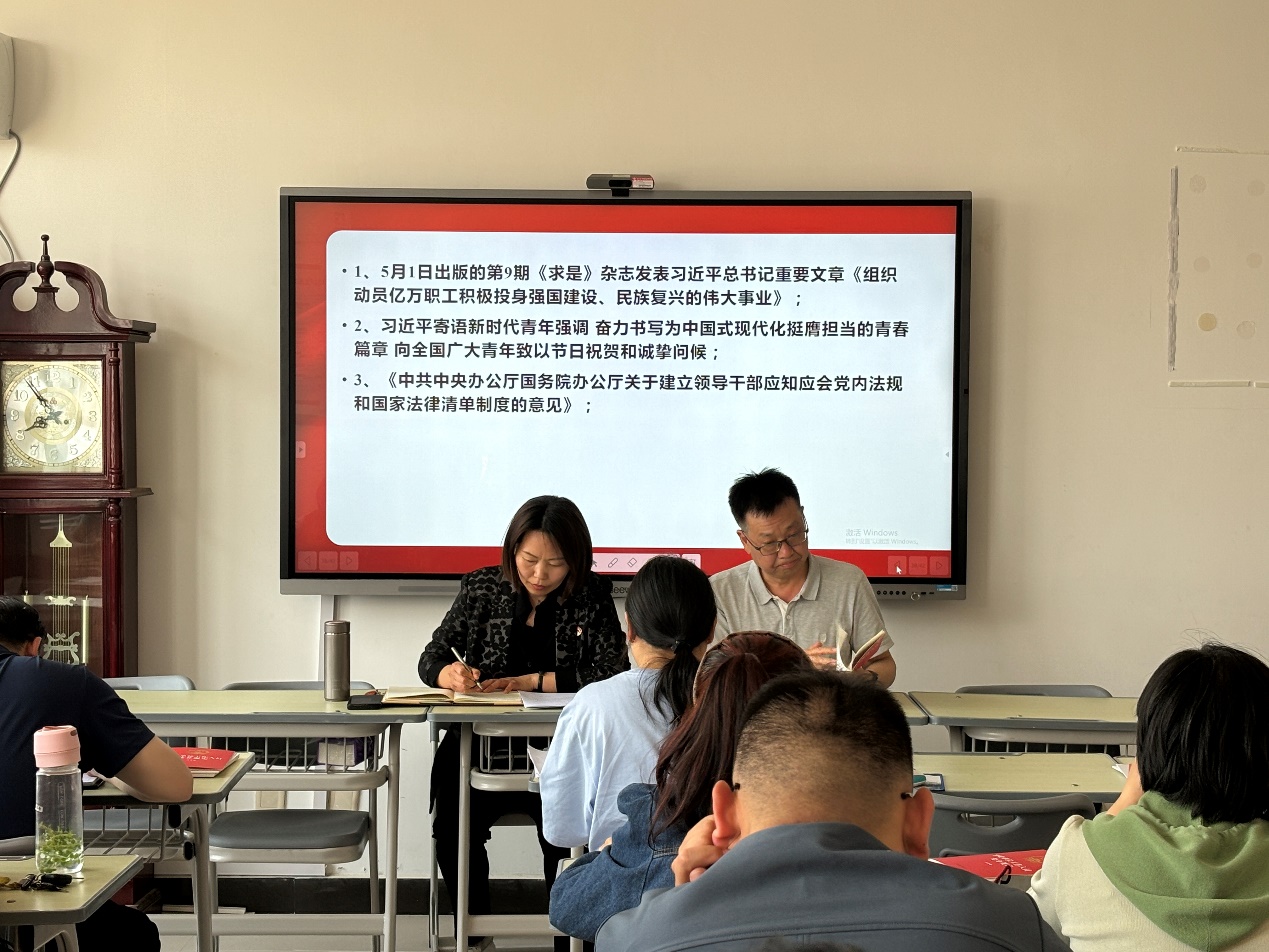 会上,大家共同学习了:《求是》杂志发表习近平总书记重要文章《组织动员亿万职工积极投身强国建设、民族复兴的伟大事业》、《中共中央办公厅国务院办公厅关于建立领导干部应知应会党内法规和国家法律清单制度的意见》和习近平寄语新时代青年强调:奋力书写为中国式现代化挺膺担当的青春篇章,向全国广大青年致以节日祝贺和诚挚问候。