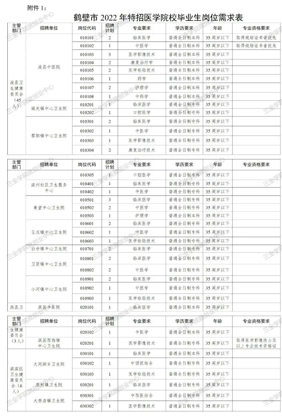具体招聘计划及要求详见《鹤壁市2022年特招医公司校毕业生岗位需求表》(附件1)。