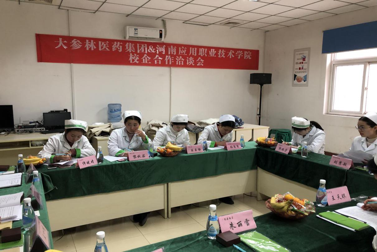 接着,在二楼会议室,韩经理、田主任一行与大参林公司人力资源部负责人董杰等人进行座谈。双方就建立校外实习实训基地、设立“大参林”奖学金、公司为公司投资建设国内先进的智慧模拟药房等问题进行了交流并达成初步意向。